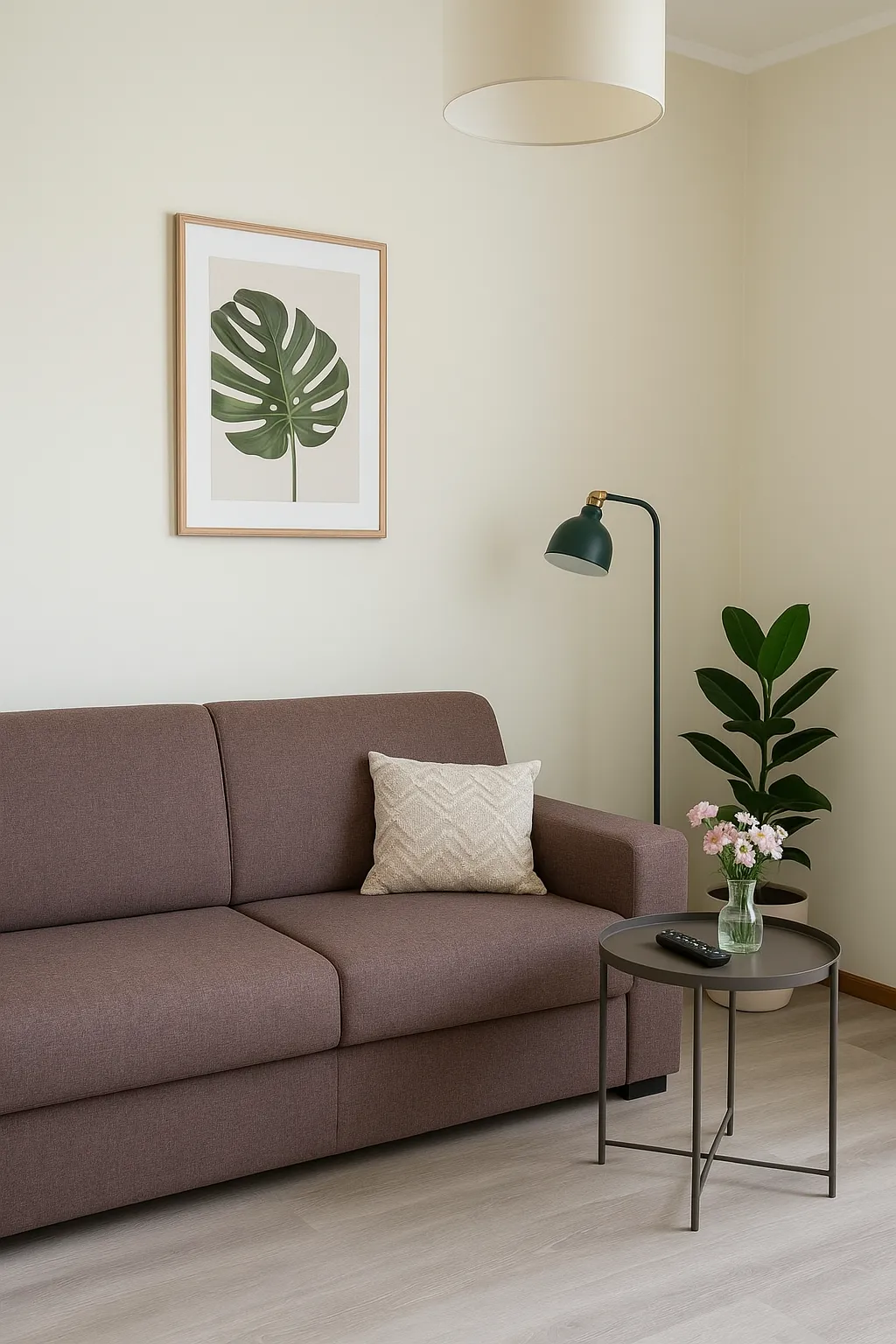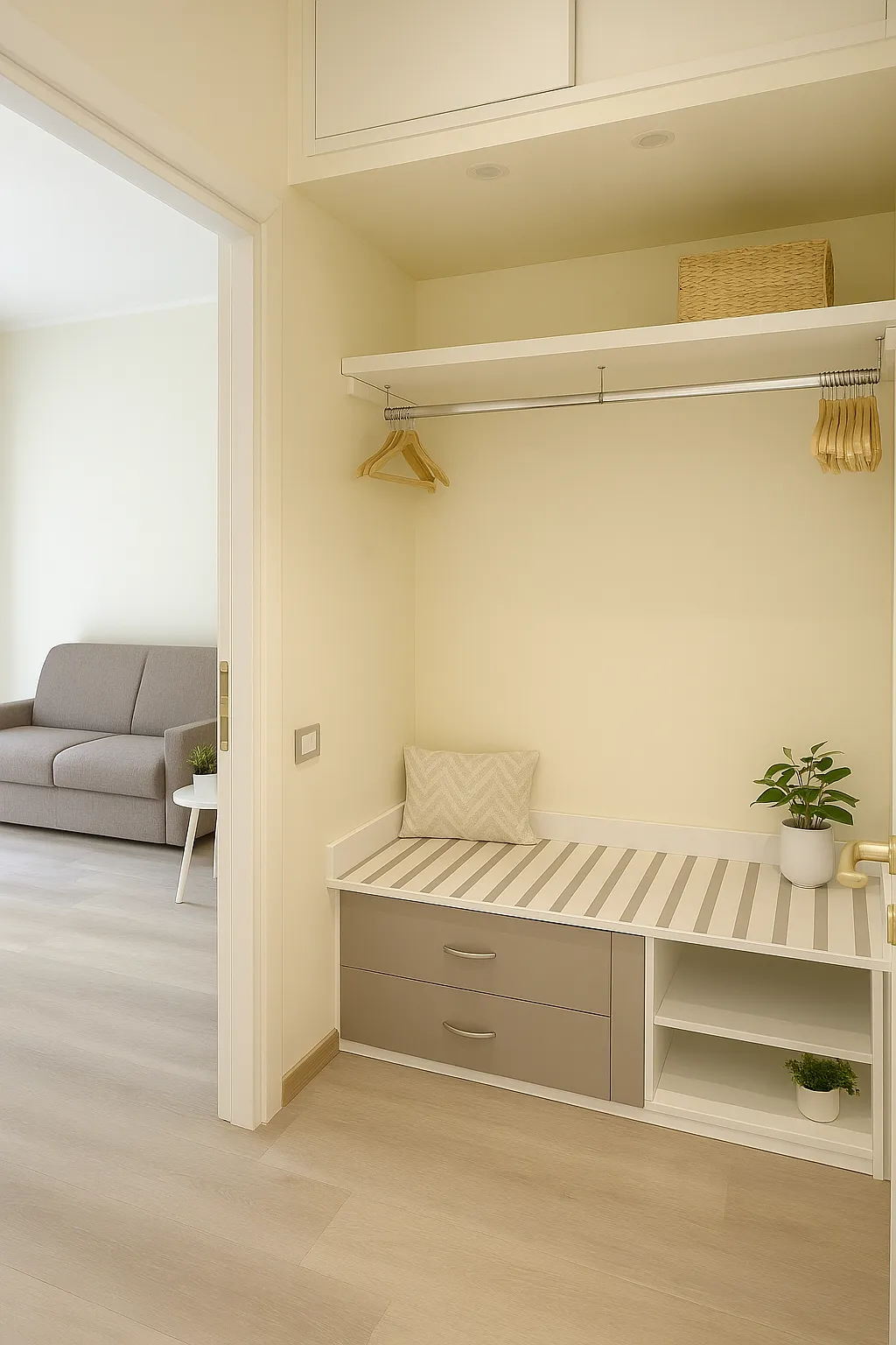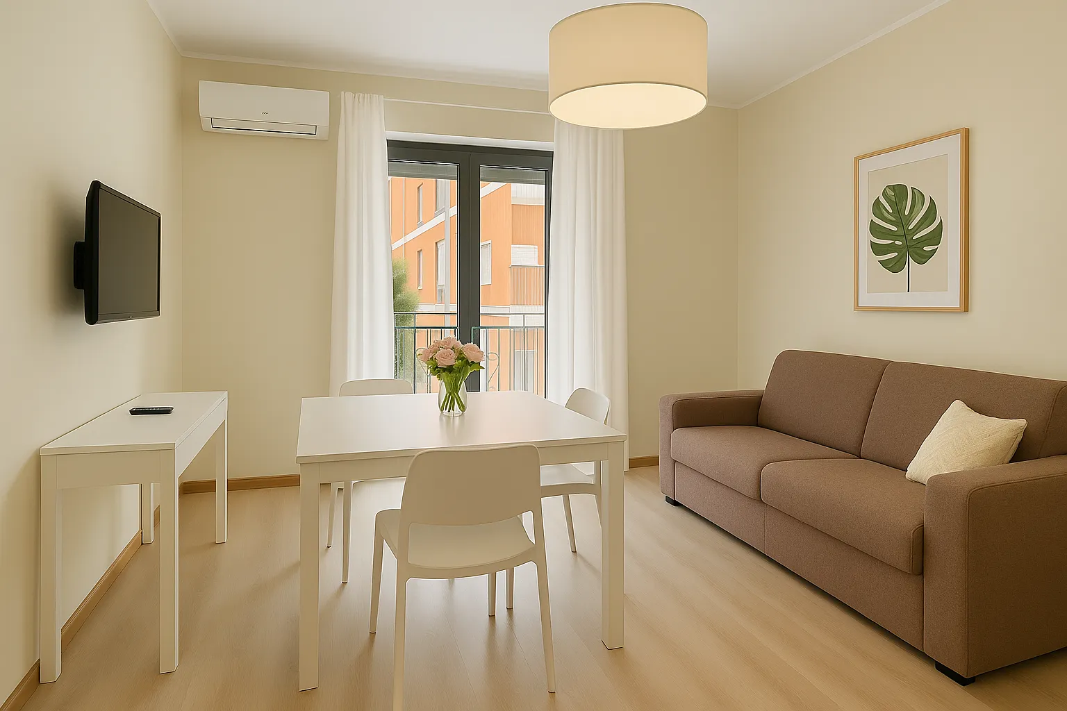 Soggiorno con divano letto, TV smart, tavolo e sedie, cabina armadio.